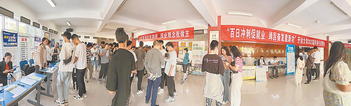汴梁晚报6月10日图片新闻  百日冲刺促就业,踔厉奋发建新功。6月6日上午,bat365在线官方网站2023届毕业生招聘会举行。此次招聘会邀请了26家用人单位,提供了614个岗位,很多毕业生当场与用人单位签订了就业意向。