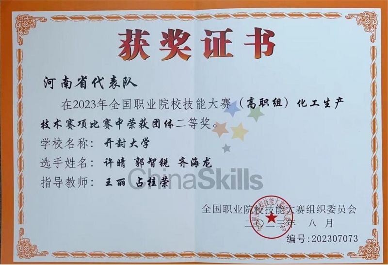 河南教育宣传网9月2日讯  8月22日,2023年“中银杯”全国职业院校技能大赛(高职组)化工生产技术赛项在兰州石化职业技术大学进行,bat365在线官方网站材料与化学工程学院王丽和占桂荣老师指导的许晴、郭智锐、齐海龙三位同学组成的河南代表队荣获团体二等奖。