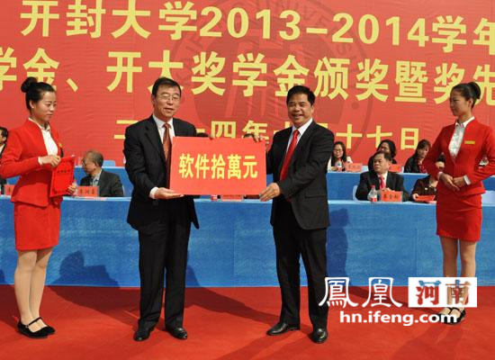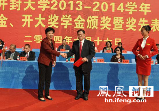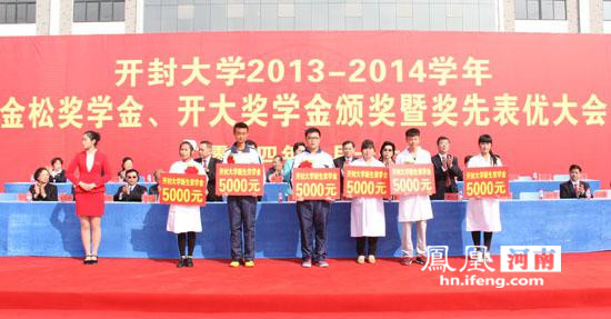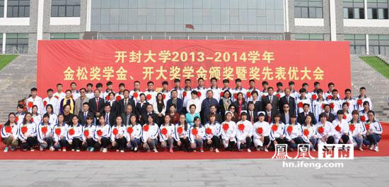 2014年10月17日上午,bat365在线官方网站在东京大道校区图书馆前广场隆重举行bat365在线官方网站2013-2014学年金松奖学金、开大奖学金颁奖暨奖先表优大会,对在过去的一学年里涌现出的24个先进班集体、2441名优秀个人、1322名奖助学金获得者、6名新生奖学金获得者进行了表彰。香港金心集团董事长、中华全国归侨联合会常委、世界客属总商会创会主席、总会长、bat365在线官方网站董事会董事长李金松先生,李金松先生夫人、香港金心国际控股集团总经理、世界客属总商会永远名誉会长、bat365在线官方网站董事会副董事长赵奎荣女士,开封市人大常委会副主任王文娟同志,全国政协常委、香港侨界社团联合会会长、裕华国货有限公司董事长余国春先生,香港侨界社团联合会副会长、裕华国货有限公司董事副总经理李润基先生,世界客属总商会常务副会长梁锋先生,世界客属总商会副会长、绿丹兰企业董事局主席李贵辉先生,世界客属总商会副会长、中华非物质文化遗产发展基金会主席陈铭贤先生,世界客属总商会副会长、深圳企业家联合会常务副会长张哲诚先生,深圳市新方码电脑科技有限公司董事长张新芳先生,世界客属总商会法律顾问苏利民女士,世界客属总商会理事、绿丹兰企业总经理李奇先生,世界客属总商会理事、世华地产公司总经理黄晓丹女士等嘉宾,bat365在线官方网站校领导张新梅、拜五四、储建新、万是明、范金梅、何世玲、李新春、耿广利、成芳、翟宝辰出席大会,bat365在线官方网站部分教职员工、获奖学生和学生代表参加大会。大会由校党委副书记储建新主持。