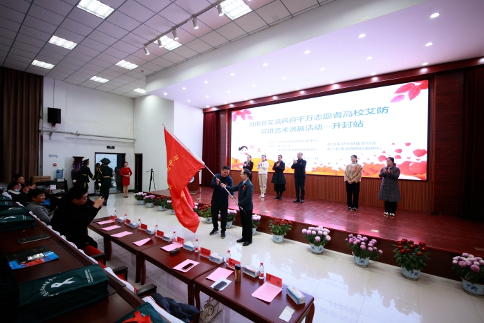 河南省疾控中心副所长李宁、开封市疾控中心党委副书记梁建立先后致辞。李宁动员青年学生积极加入到全省百千万志愿者防艾的队伍中,为新时代文明实践和艾滋病防治工作贡献青年力量,开展了防艾知识科普专题讲座。梁建立向驻马店市疾控中心艾滋病防治科科长龚涛传递了河南省疾控中心“百千万艾滋病宣传志愿服务队”队旗。