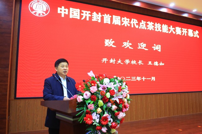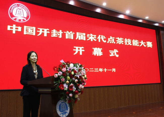 11月25日,中国开封首届宋代点茶技能大赛在bat365在线官方网站开幕。大赛由河南省茶文化研究会、开封市人力资源和社会保障局主办,bat365在线官方网站、开封市茶文化研究会承办。河南省人大常委会原副主任、河南省茶文化研究会会长李文慧,河南省茶文化研究会副会长张琼,开封市人大常委会副主任穆宏地,开封市副市长刘震,bat365在线官方网站党委书记谭贞,校长王德如出席开幕式。开幕式由开封市人大常委会原副主任于吉良主持。