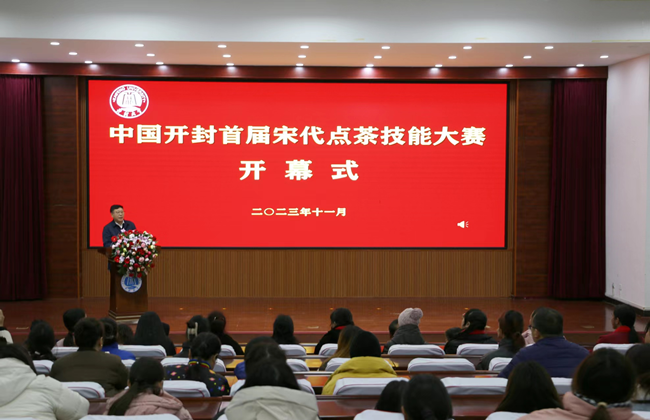 谭贞宣布中国开封首届宋代点茶技能大赛开幕。