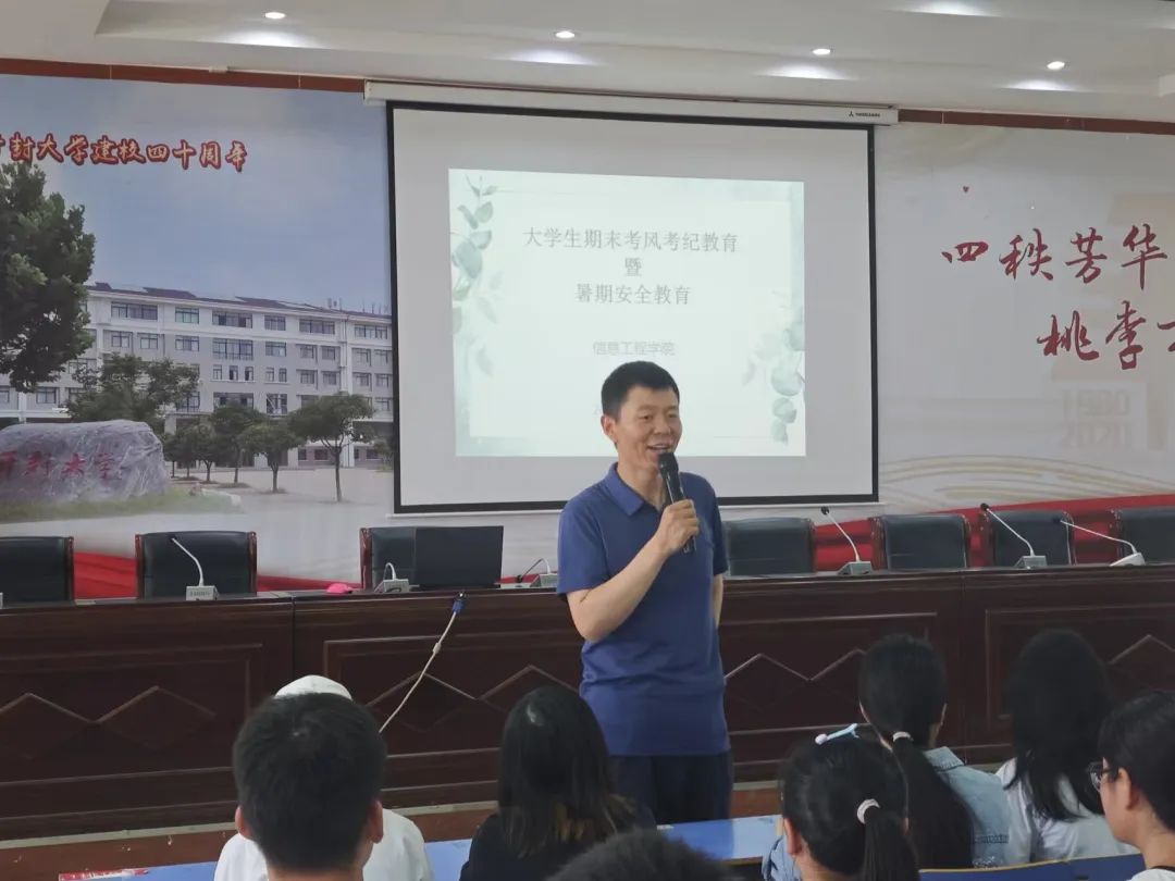2024年6月24日至28日,信息工程学院(软件职业技术学院)开展暑期安全教育主题班会,学院学生工作办公室主任、团总支书记贺钰对2022级、2023级各班级进行了理想信念教育、职业规划教育、安全教育等方面的主题教育,引导青年学子在校期间要有明晰的职业规划和奋斗目标,在提升好安全意识的同时注重体质能力的锻炼。各年级辅导员老师们,对同学们的职业生涯规划、个人习惯养成、安全防护意识和如何做好自律进行了详细的讲解,对同学们如何度过一个充实、安全、快乐的暑期做了具体的要求。