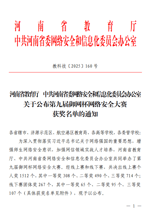 (来源:高校信息网)近日,河南省教育厅、中共河南省委网络安全和信息化委员会办公室联合发布第九届“御网杯”网络安全大赛获奖名单通知,我校共斩获一等奖1项、二等奖2项、三等奖7项。