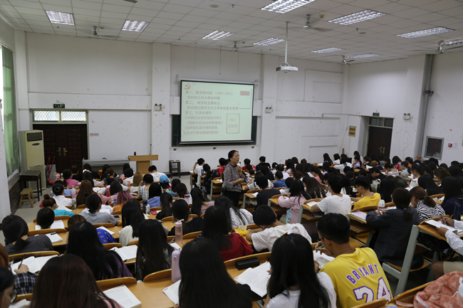 张兰玲教授课堂上讲授了“毛泽东思想的形成和发展”一节。在讲授的过程中,张教授紧贴教材,以问题为导向,理论联系实际,加强师生互动,调动学生的学习积极性,详细讲述了毛泽东思想形成发展的过程,并采用了翻转课堂等多种教学方式,授课期间用歌唱经典革命歌曲、朗诵毛泽东诗词等方式提高同学们的学习兴趣,教室里时时响起同学们的热烈掌声。