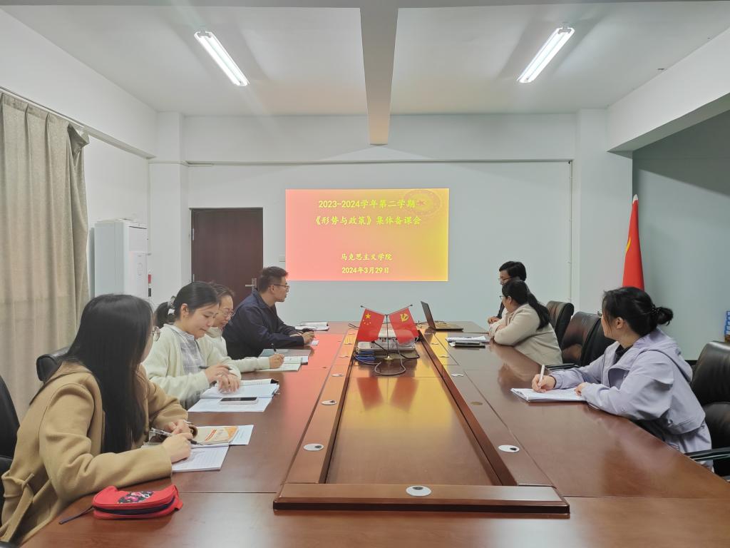 为深入学习贯彻习近平新时代中国特色社会主义思想,更有针对性地宣讲党的大政方针政策,引导学生准确理解党的基本理论、基本路线、基本方略。3月29日下午,马克思主义学院召开2024年春季学期“形势与政策”集体备课会。马克思主义学院副院长左慧琴、“形势与政策”课教研室全体教师参加会议。