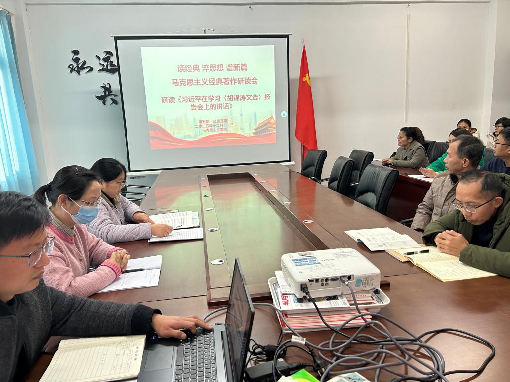 12月11日下午,马克思主义学院开展第五期“读经典 淬思想 谱新篇”马克思主义经典著作研读会。学院教师卢雪带领全体思政课教师,专题研读《习近平在学习〈胡锦涛文选〉报告会上的讲话》。