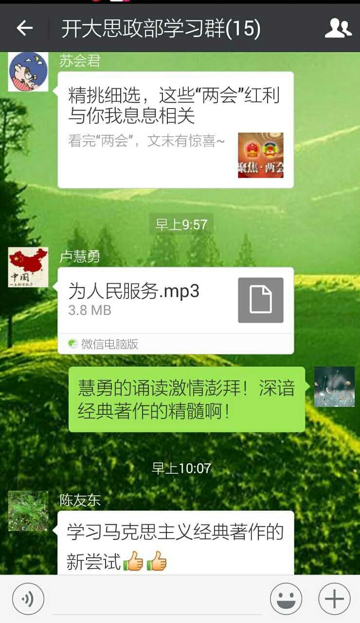 马克思主义经典原著是马克思主义理论体系精神实质和思想精髓的集中体现。思政部全体教师根据自己的专业,在理解原著的基础上,利用网络微信平台,建立了学习群,每位教师都在群里去读一些原著的文章。声音不仅传递了思想,也表达了情感,同时也增加了学习的趣味性和互动性。