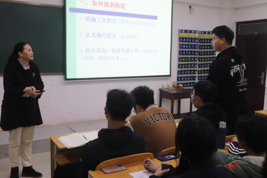 李春霞先后从如何做到“称职”和“称心”两方面展开详细讲述,她强调,学生干部一要带头学习贯彻党的二十大精神,筑牢信仰之基,补足精神之钙。二要明确工作职责,然后认真履行,同时还要结合实际,创新开展工作,争取做到人无我有,人有我优。三要发挥好老师与学生之间桥梁与纽带的作用,做好上传下达,同时也要合理分配好时间,做到学习、工作两不误。四要定期开展研讨,学会交流与沟通,借以精进工作技巧,不断提高工作能力和水平。最后,李春霞分享了自己的工作经验,并与学生干部们亲切交流。