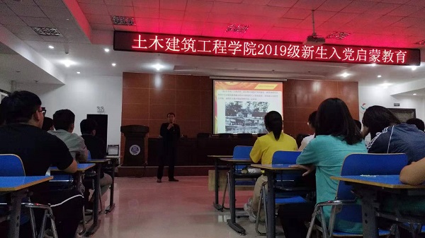 9月25日晚上7点,土木建筑工程学院在土木六楼报告厅进行2019级新生入党启蒙教育,学院党总支副书记武志远为学院2019级全体新生同学进行讲授。