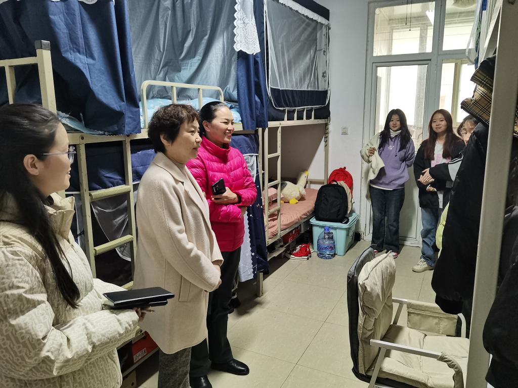 在走访过程中,成芳首先向大家致以新春祝福,并与同学们亲切交谈,仔细询问了学生们的假期生活、新学期规划等,鼓励大家养成健康文明、积极向上的生活习惯,以更加积极饱满的精神状态投入到新学期学习生活中。学院党总支书记李春霞在表达对同学们的关心之余,勉励同学们加强自我管理,严格落实安全用电、宿舍管理等相关制度,营造整洁有序、温馨和谐的宿舍文化氛围。