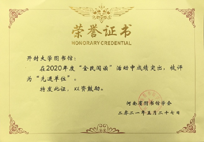 近日,在河南省图书馆学会第十次会员代表大会上,我校图书馆被河南省图书馆学会授予河南省2020年度“全民阅读”先进单位称号,这是我校图书馆连续四年获此荣誉。