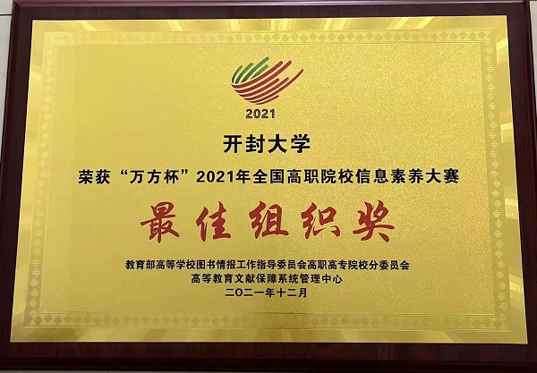 教育部高等学校图书情报工作指导委员会高职高专院校分委员会与高等教育文献保障系统管理中心组织的全国高职院校信息素养大赛是贯彻《职业教育改革实施方案》、《教育信息化 2.0 行动计划》、《普通高校图书馆规程》有关文件精神,落实《高等学校数字校园建设规范(试行)》关于开展信息素养教育的总体要求,持续推动全国高职院校信息素养教育工作而开展的。我校广泛宣传、积极动员、分类指导,组织80多位学生完成了校级选拔赛,5名学生晋级省赛,2名学生在省赛中脱颖而出冲击到国赛,图书馆荣获教育部颁发的“最佳组织奖”。