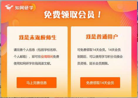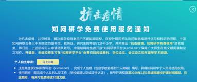 为抗击疫情,共克时艰,解决部分知网老用户不能如期返校,在校外期间无法访问数据库进行学习和科研的问题,中国知网将为我校师生推出 “抗击疫情,知网研学免费使用”读者服务。