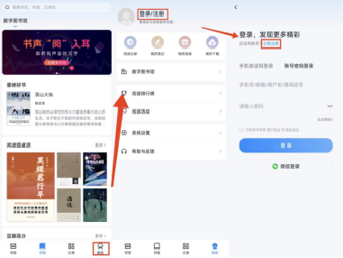 进入书城点击“我的”—“注册登录”,输入手机号注册即可。