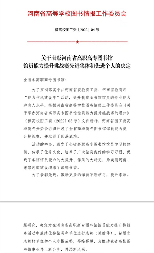 5月23日,河南省高等学校图书情报工作委员会表彰了高职高专图书馆馆员能力提升挑战赛中获得先进的集体和个人,我校图书馆获得最佳组织奖,二十位馆员获得个人奖项。