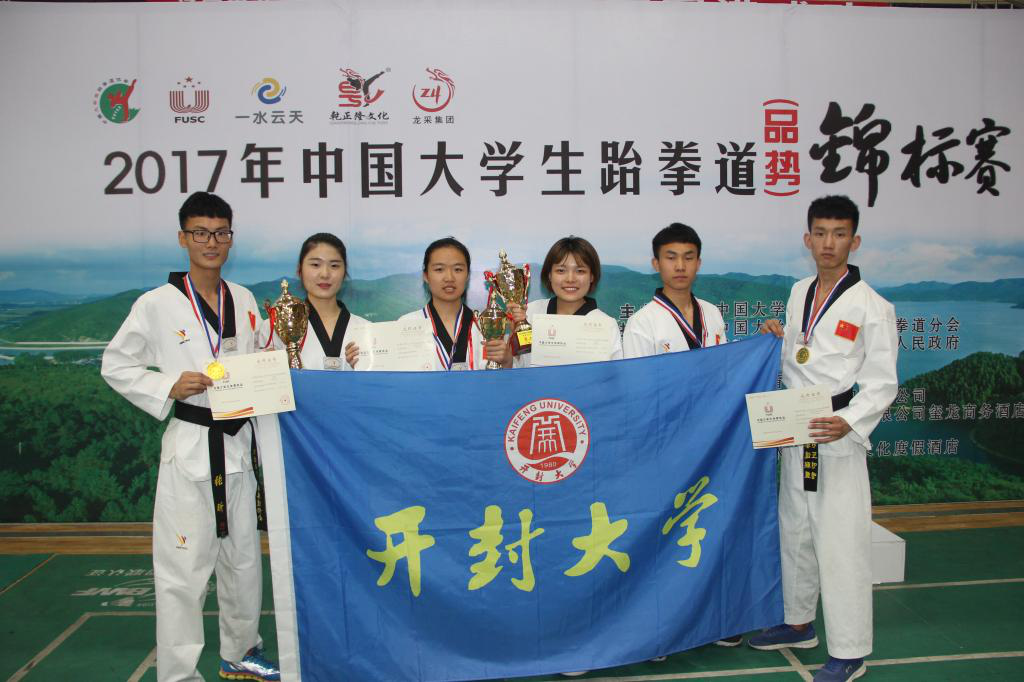 6月18日至23日,2017年中国大学生跆拳道锦标赛在辽宁省辽阳市弓长岭区体育馆举行。我校代表队获得品势男团比赛冠军、跆拳舞比赛亚军、四个季军、三个个人第五名、一个团体总分第一名、一个团体总分第四名的好成绩。我校代表队获得体育道德风尚运动队荣誉称号,体育教研部胡红权老师获得“优秀教练员”荣誉称号,财政经济学院胡莹港同学获得“优秀运动员”荣誉称号。