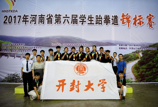 8月26日至29日,由河南省教育厅主办、河南省体育总会跆拳道协会承办的2017河南省学生跆拳道锦标赛在平顶山工业职业技术学院举行,我校由20位同学组成的代表队在大赛中荣获品势团体总分第一名、男子团体竞技总分第一名的好成绩,在品势和竞技的比赛中获得6项冠军,我校获得“河南省跆拳道示范校”荣誉称号。