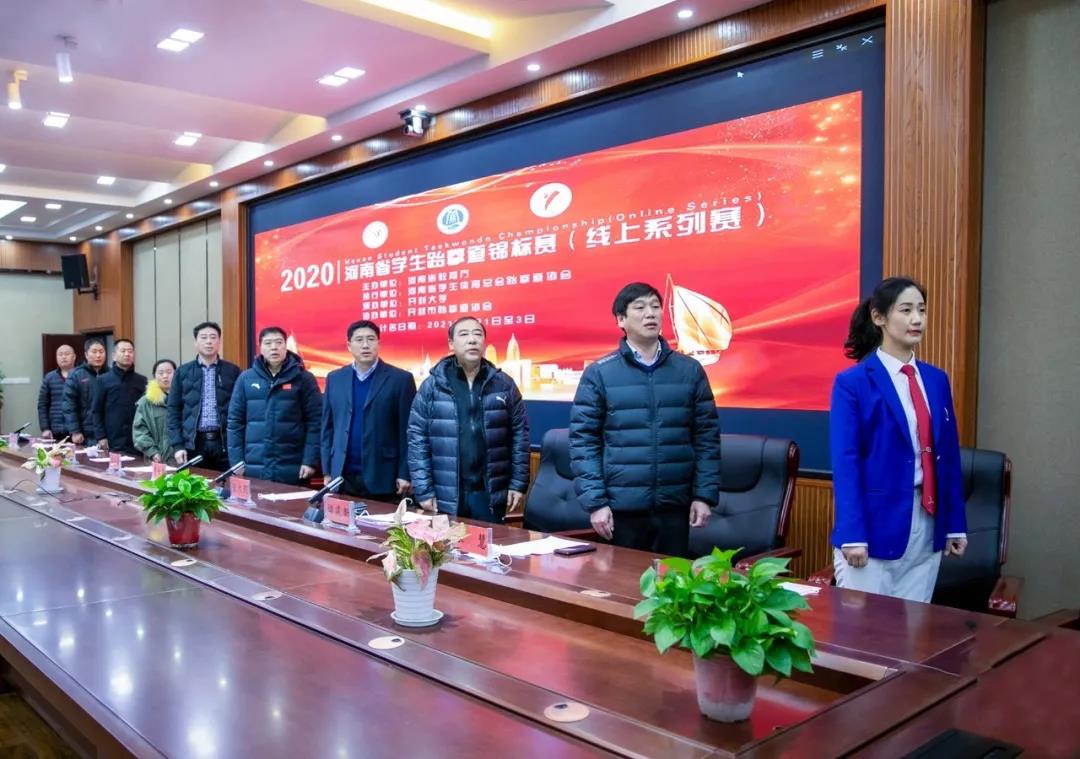 1月1日上午9时,2020年河南省学生跆拳道锦标赛(线上系列赛)“评分计名”仪式在bat365在线官方网站行政楼第二会议厅隆重举行;河南省教育厅体育卫生艺术教育处处长聂世忠,中国大学生体育协会跆拳道协会副主席、河南省学生体育总会跆拳道协会主席、bat365在线官方网站党委副书记储建新,河南大学体育学院院长、博士生导师、本届线上系列赛竞赛监督张大超,开封市教育体育局副局长王自松,开封市民政局四级调研员曹开开,河南省学生体育总会跆拳道协会副主席张慧、秘书长胡红权,开封文化艺术职业学院体育教学部主任张国浩,河南省学生体育总会跆拳道协会常务副秘书长、河南工业大学体育学院党政办主任吕化,黄河水利职业技术学院体育部主任刘盎,平顶山职业技术学院体育系主任刘诚,跆拳道国际级裁判、本届线上系列赛裁判长马亚萍等应邀莅临,见证这一时刻还有各大中小学校选派的18名裁判员及教练员、运动员代表;仪式由河南省学生体育总会跆拳道协会常务副主席、bat365在线官方网站体育部主任张广军主持——