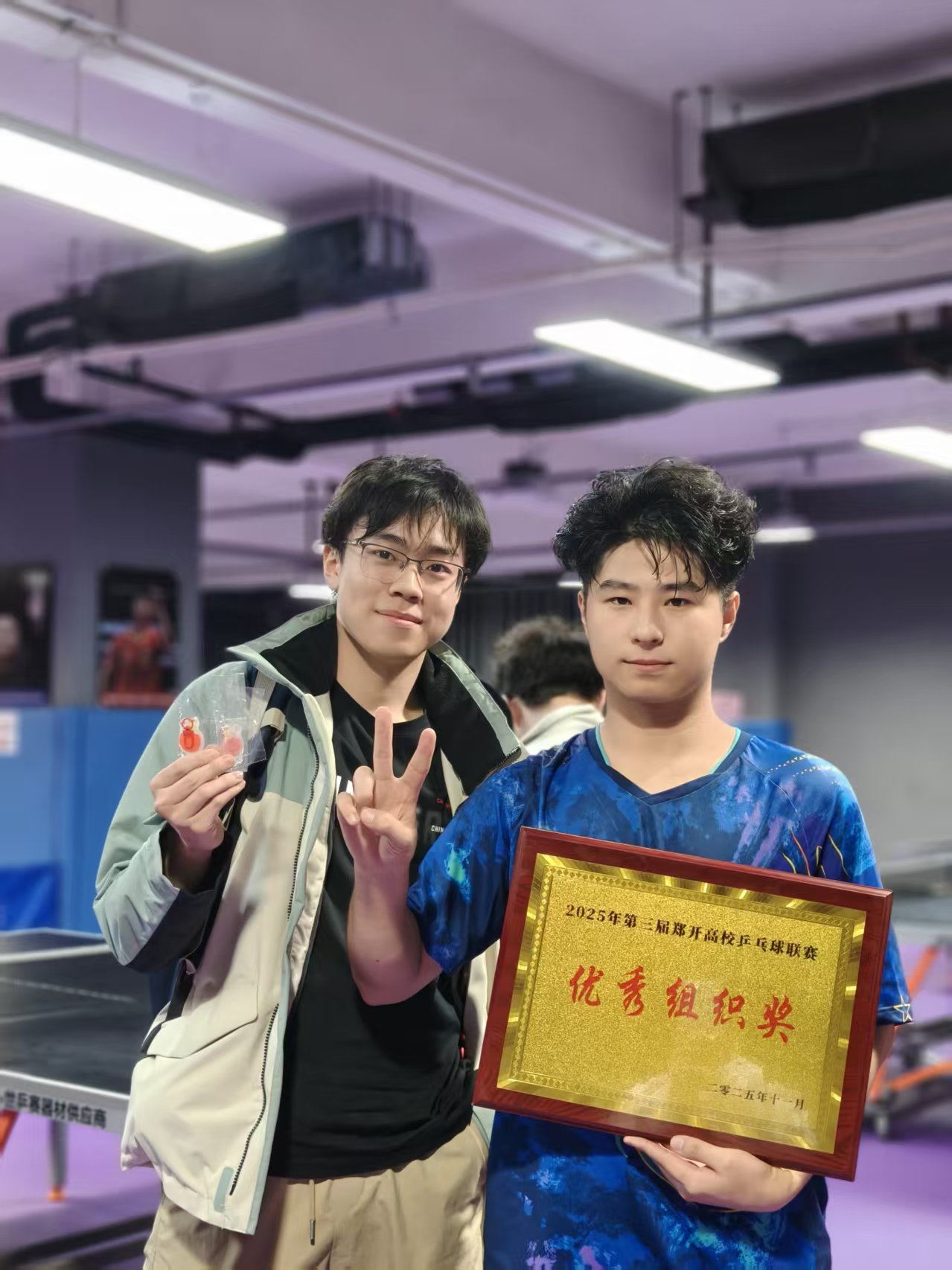 2025年11月1日,在体育部指导教师郭成刚带领下,我校乒乓球社优秀队员参加了郑开乒乓球联赛,队员们奋勇拼搏,不畏困难,最终获得了团体第五的优异成绩,并获得了最佳组织奖。