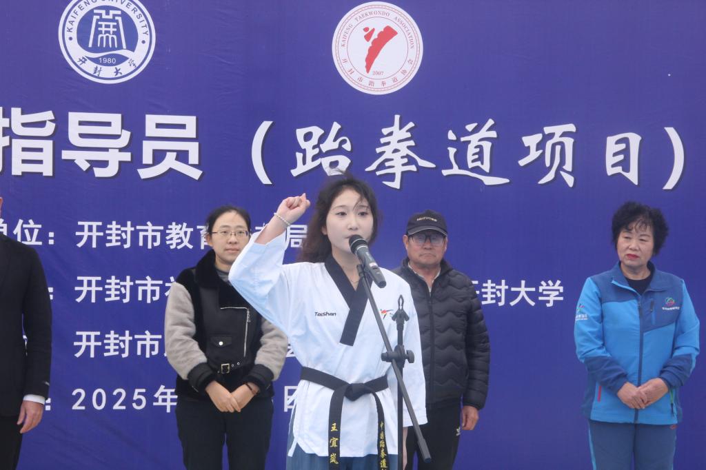 随后学员代表进行了宣誓活动,讲师团进行了动作展演,此次培训班主要围绕跆拳道项目的教学技巧、训练方法以及最新竞赛规则展开深入学习与实践,这对我市跆拳道社会体育指导员的业务能力提升以及更好地服务广大跆拳道爱好者具有重要意义。各位学员将以本期培训为契机,做到学以致用、创新发展。通过参加培训,不仅要提高自身的专业素养和指导能力,更要将所学知识和技能运用到实际教学与训练指导中,不断创新教学方法和指导模式,为我市跆拳道项目的推广和发展贡献自己的智慧和力量;鼓励各位学员在今后的教学和指导实践中不断总结经验、勇于探索,进而走出一条具有开封特色的跆拳道社会体育发展之路。