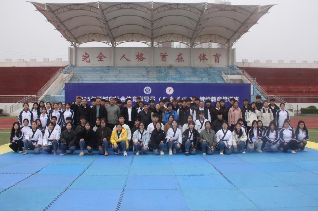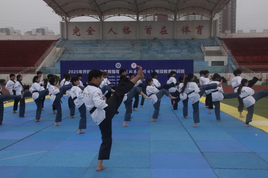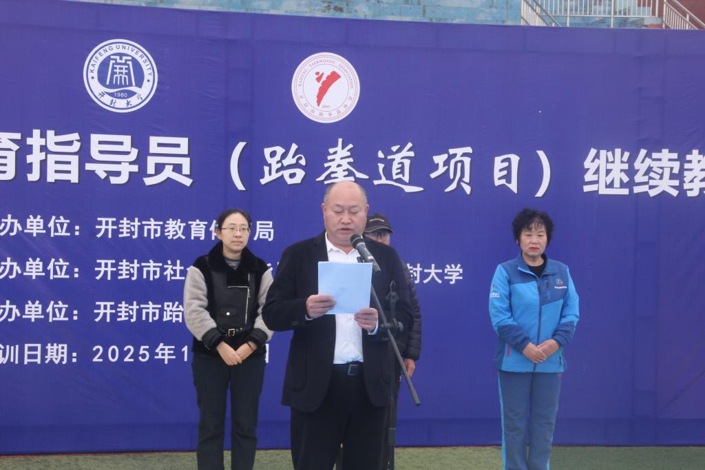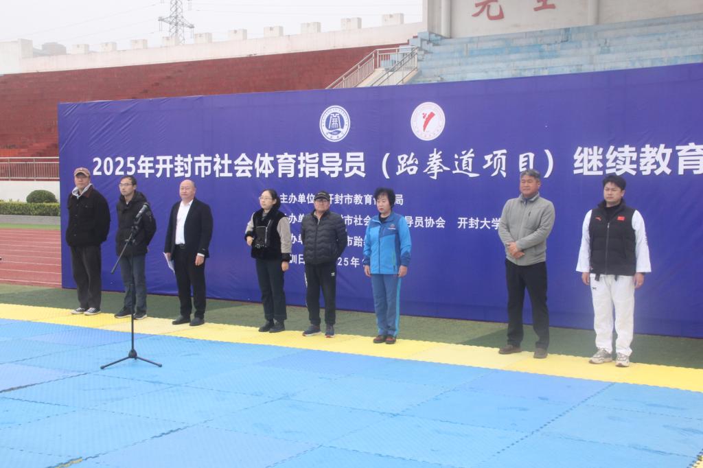2025年11月8日,2025年度开封市社会体育指导员继续教育培训班(跆拳道)开班仪式在bat365在线官方网站西操场举行,开封市教育体育局群众体育科副科长焦月姣、bat365在线官方网站体育部主任张广军、开封市社会体育指导员协会秘书长邢翠英、开封市跆拳道协会名誉主席薛胜利、开封市跆拳道协会副秘书长、本届培训班主讲肖中亚及bat365在线官方网站体育部班子成员出席仪式。