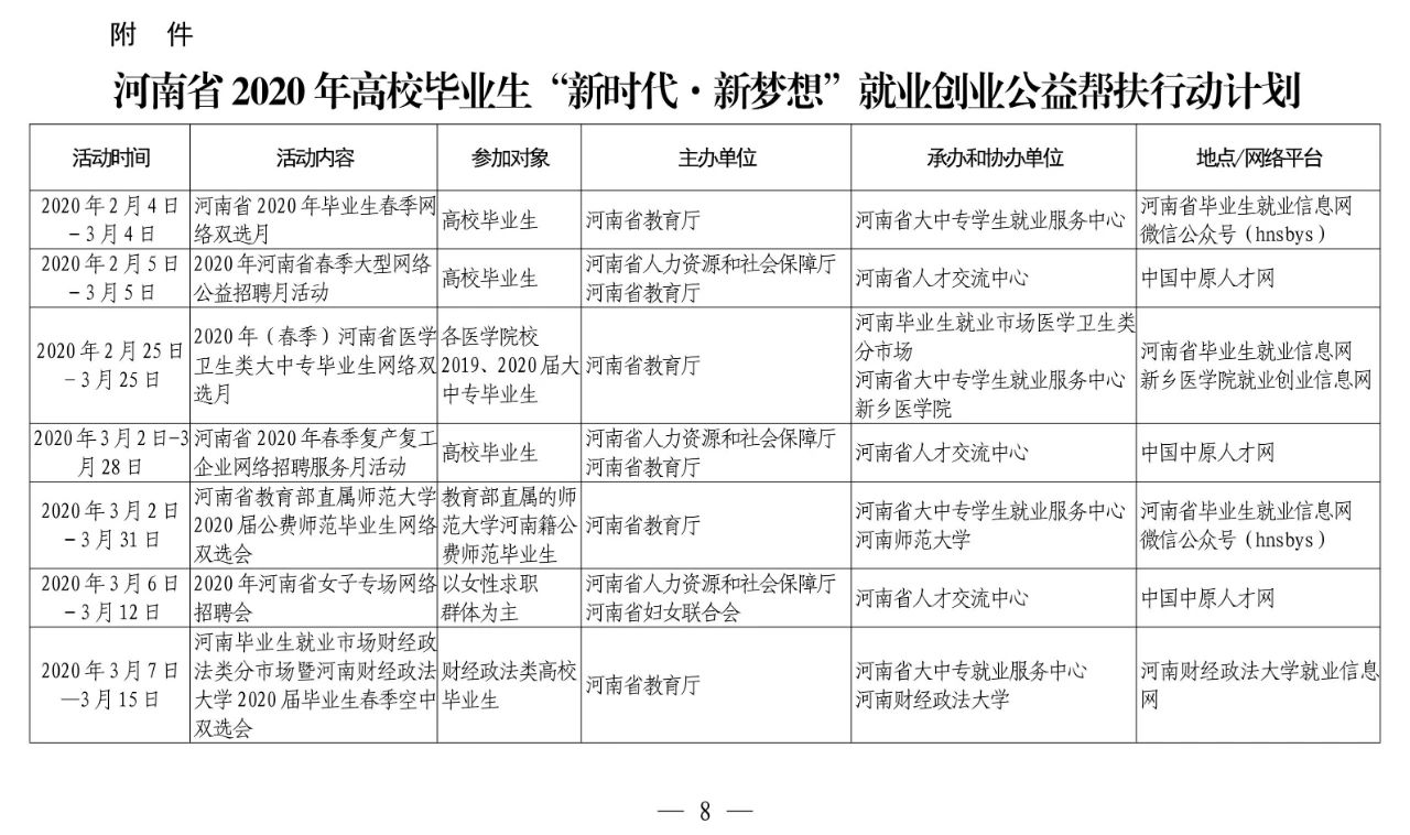 为落实教育部等六部门2020届普通高校毕业生就业“百日冲刺”行动,最大限度降低新冠肺炎疫情对高校毕业生就业的影响,省教育厅、省发展和改革委员会、省工业和信息化厅、省财政厅、省人力资源和社会保障厅、省文化和旅游厅、省退役军人事务厅、省人民政府国有资产监督管理委员会、省军区动员局、共青团河南省委员会、省妇女联合会、省残疾人联合会、省工商业联合会、国家开发银行河南省分行14部门于近日联合下文,共同实施“河南省2020年高校毕业生‘新时代·新梦想’就业创业公益帮扶行动”。
