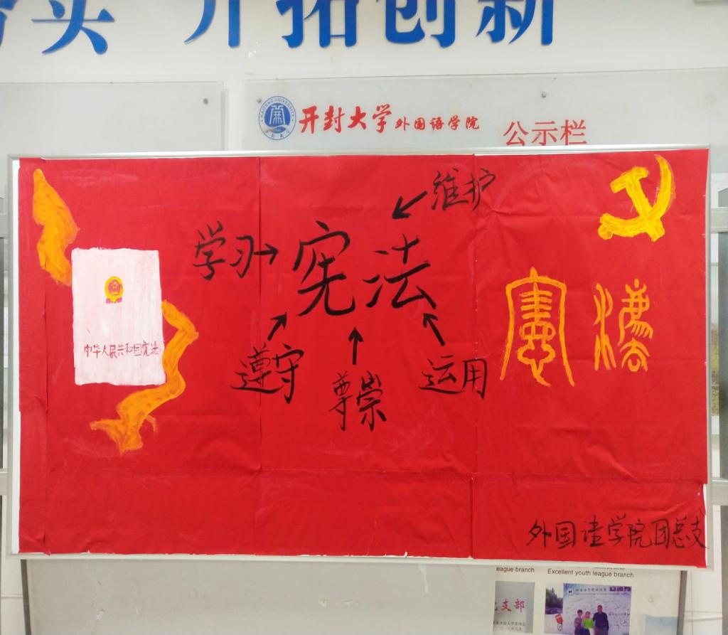 12月4日是我国第四个国家宪法日。为宣传国家宪法日,进一步普及宪法知识、弘扬宪法精神,外国语学院以“尊崇宪法、学习宪法、遵守宪法、维护宪法、运用宪法”为主题在12月4日前后开展了系列宣传教育活动,旨在维护宪法权威、弘扬宪法精神,进一步增强全体师生的宪法意识。