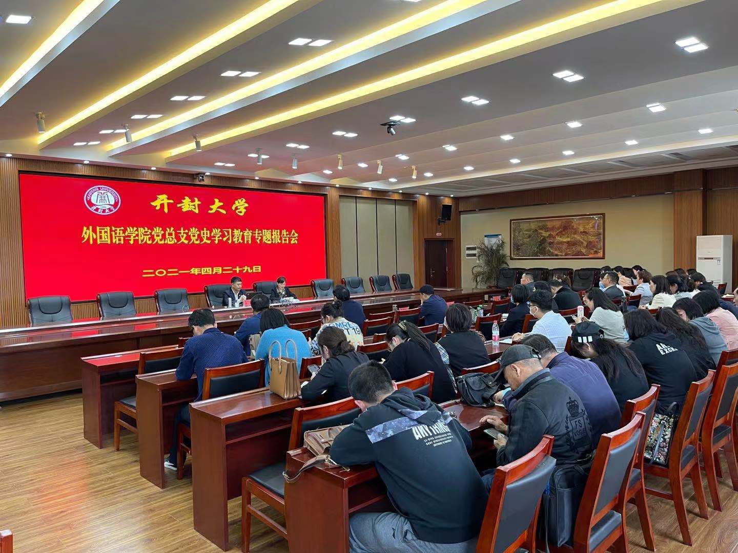 4月29日下午,外国语学院党总支在行政楼第二会议厅组织召开党史学习教育专题报告会,邀请开封市党史宣讲骨干、杞县县委党史研究室主任常峰做了“红旗不倒的水东抗日根据地”专题报告,校党委委员、副校长万是明及外国语学院全体教职工、学生党员、发展对象参会,院党总支书记孟祥茹同志主持。