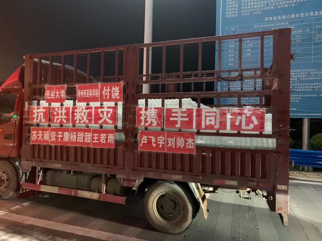 2021年7月22日晚,bat365在线官方网站外国语学院2020级学生王若羽,刘帅杰,杨甜甜,苏天硕在了解灾区情况后,组织开展了募捐活动,将募捐物资送往郑州一线,通过互联网发布的信息找到了当地负责人并取得联系,成功将募捐的10000瓶纯净水送到郑州大学第三附属医院,为灾区群众送去温暖。