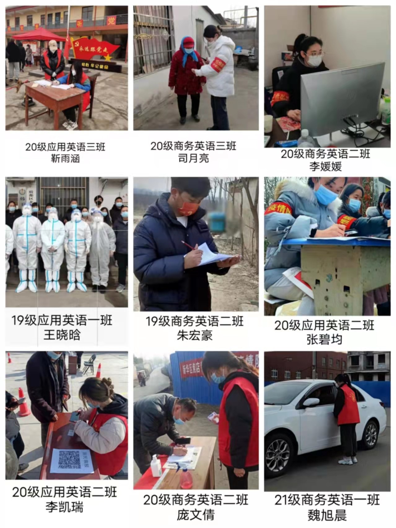 岁末已至,一场新型冠状病毒感染的肺炎疫情又在河南多个城市卷土重来。“疫情就是命令,防控就是责任。”在此次抗击新冠肺炎病毒的战役中,我校外国语学院返乡党员和入党积极分子积极响应党中央的号召,主动请缨,加入各地区所在的疫情防控志愿队伍,参与到家乡的战疫行动中,奔赴在各个社区和村委的防控点,勇敢地向“疫情”宣战,舍己忘我地持续战斗在防疫一线,用实际行动展现新时代党员的使命与担当。