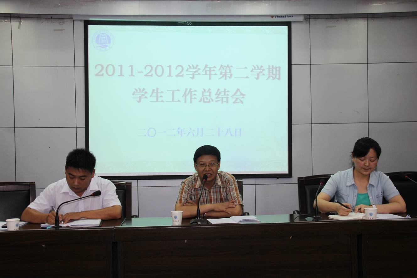 6月28日下午,我校在行政楼二楼会议厅召开了2011-2012学年第二学期学生工作总结会。各院部党总支副书记、全体辅导员及学生工作部全体人员参加了会议。学生工作部及团委对本学期学生工作做了总结,并对下学期学生工作作了安排和部署。副校长万是明出席了会议并作重要讲话。