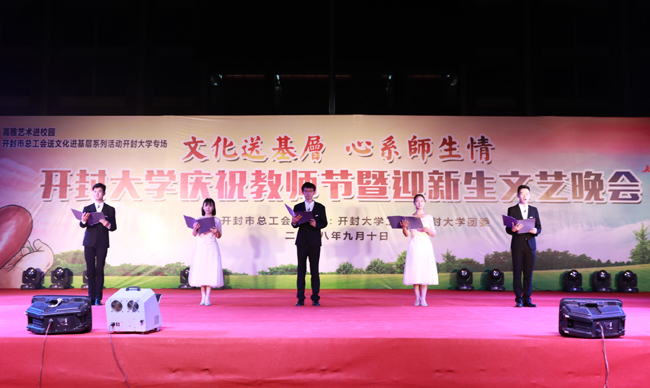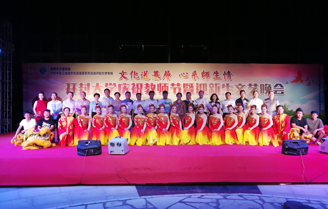 9月10日晚,由开封市总工会主办,我校工会和团委协办的“文化送基层 心系师生情”bat365在线官方网站庆祝教师节暨迎新生文艺晚会在我校大观广场隆重举行。校领导陈灿、宋志敏、储建新、万是明、赵辉、成芳、马林强出席了活动,开封市总工会副主席李伟、宣教部邓振武亲临了晚会现场。