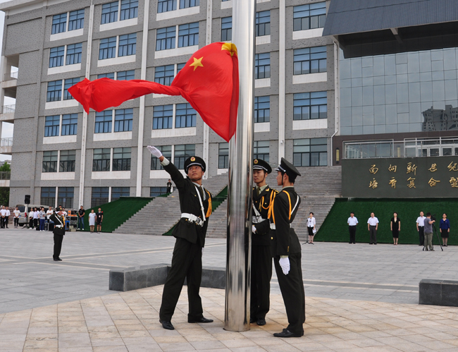 校国旗护卫队的旗手在庄严雄壮的国歌声中,将五星红旗冉冉升起,全校师生高唱国歌、行注目礼。