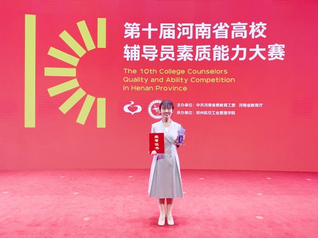 本站讯 4月22日至4月24日,由省委教育工委、省教育厅主办的河南省第十届高校辅导员素质能力大赛在郑州航空工业管理学院举办。我校辅导员陈玫含老师凭借着良好的综合素质和沉稳的现场发挥,在此次比赛中荣获一等奖。