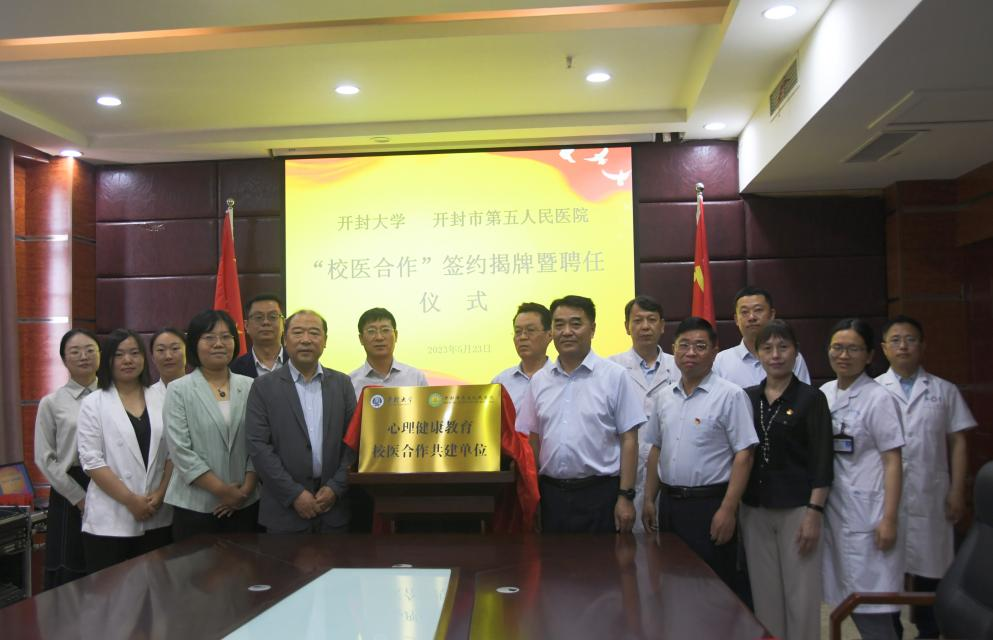 本站讯 5月23日上午,我校与开封市第五人民医院(以下简称“市五院”)“校医合作”签约揭牌暨聘任仪式在市五院举行。市五院党委书记李志献、院长王年喜、工会主席刘树林、纪委书记陈金红、副院长王成柱、相关科室负责人及聘任专家代表,我校党委副书记储建新,学生工作部、心理健康教育中心相关负责人,心理健康教育专兼职教师代表出席签约揭牌暨聘任仪式,仪式由王年喜主持。