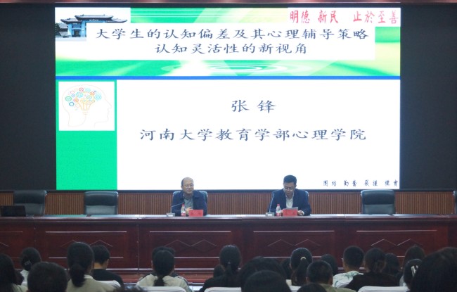 本站讯 10月26日下午,我校举办2023年心理健康教育宣传月心理健康教育专家讲座。河南大学教育学部心理学院副院长张锋教授应邀在我校行政楼第一会议厅作了“大学生的认知偏差及其心理辅导策略——认知灵活性的新视角”的专题讲座。