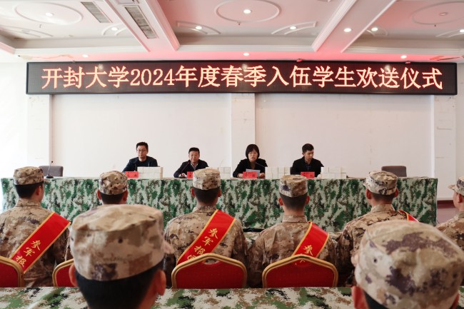 本站讯 3月15日下午,我校在开封市民兵训练基地举行2024年度春季入伍学生欢送仪式。校党委委员、副校长万是明出席仪式,校武装部、学生工作部负责人,院部教师代表及34名入伍学生参加仪式,仪式由校武装部部长付喆主持。