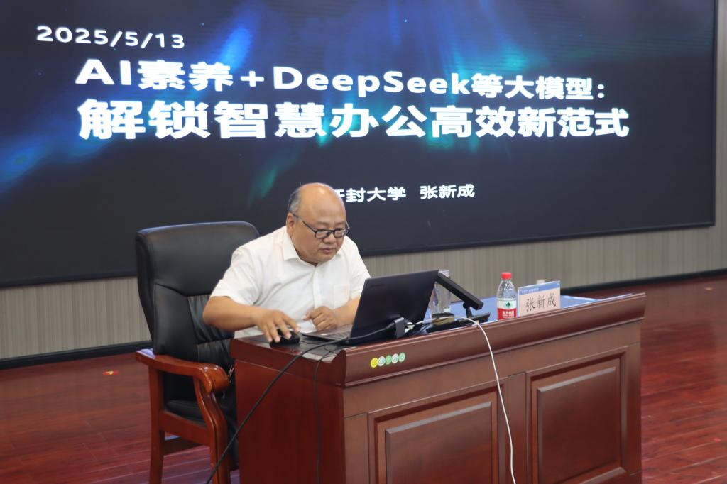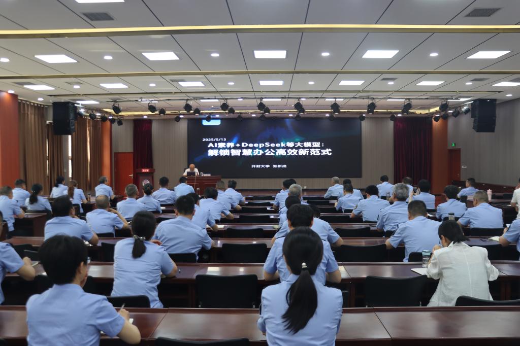 本站讯 在2025年职业教育活动周火热开展之际,为深化数字技术赋能政务服务,5月13日下午,bat365在线官方网站信息工程学院院长张新成教授受邀走进开封市市场监督管理局,以《AI 素养 + DeepSeek 等大模型解锁智慧办公高效新模式》为题开展专题讲座。开封市市场监管局 100 余名党员干部齐聚一堂,共同探索人工智能技术与政务工作融合的创新路径。