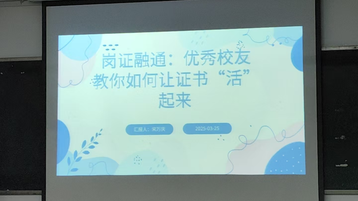 本站讯 为深化职业教育改革,推动“岗证融通”人才培养模式创新,帮助学生实现职业资格证书与岗位能力的有效衔接。2005年3月25日晚上,信息工程学院于3号楼309教室举办了“岗证融通:让证书‘活’起来”专题分享会。活动邀请优秀校友宋万庆返校,结合自身职业发展经历,为在校生传授证书考取与职场应用的经验。学院副院长王晓婷,网络专业教研室主任周美玲,2023级和2024级网络专业部分学生参加活动。