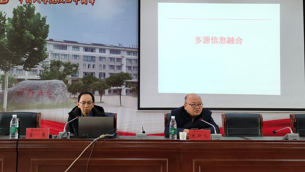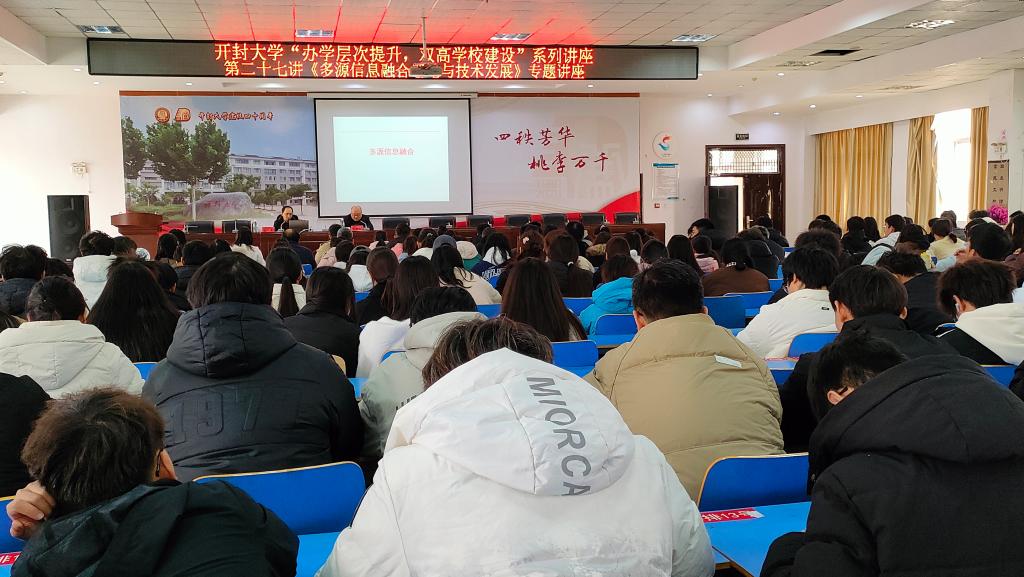 本站讯 12月12日下午,由河南大学金勇教授主讲的“开大讲坛”第二十七讲——《多源信息融合理论与技术发展》在 8号楼报告厅成功举办。此次活动由信息工程学院主办,院长张新成主持,全院300余名师生认真听取了讲座。