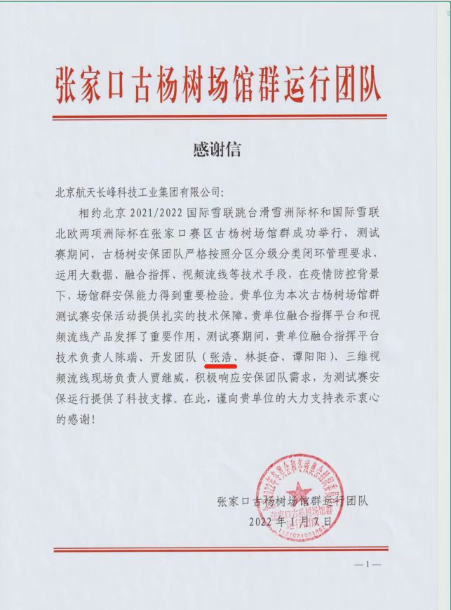 在本次冬奥会中,张浩作为主要完成人参与了古杨树场馆安保系统融合指挥平台研发、测试和保障的工作,从场馆的测试赛、冬奥会正赛以及正在举行冬残奥会全程参与保障工作,保障了跳台滑雪、越野滑雪和北欧两项等项目,并获得了场馆方的高度认可。