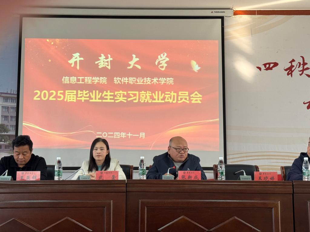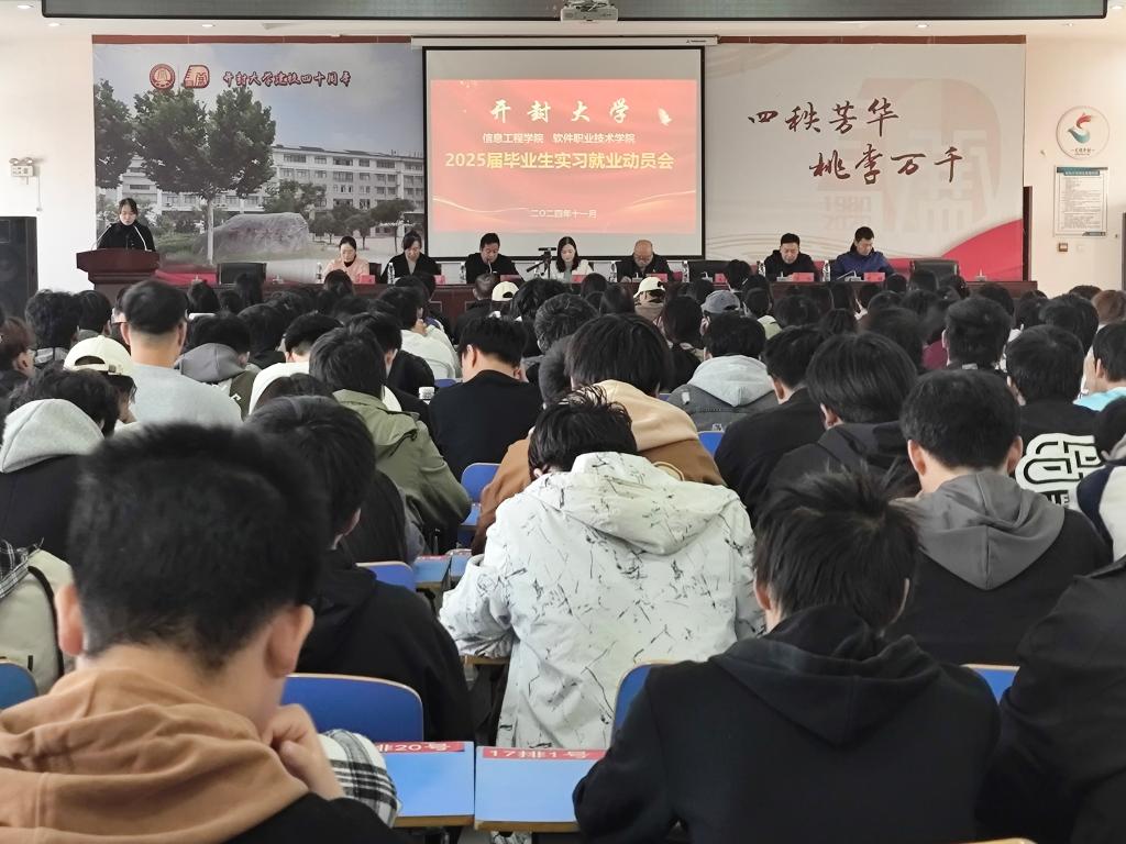 本站讯 为了更好地践行党的二十届三中全会精神,积极响应党中央、国务院提出的“高质量充分就业,强化就业优先”政策导向,信息工程学院、软件职业技术学院于11月6日在8号楼报告厅举办了2025届毕业生实习就业动员大会。学校就业指导服务中心副主任王亚辉、信息工程学院全体班子成员、各专业教研室主任、辅导员老师共同出席,与700名毕业生齐聚一堂。大会采取了线上与线下相结合的形式,设有一个主会场和三个分会场。动员大会由副院长王晓婷主持。