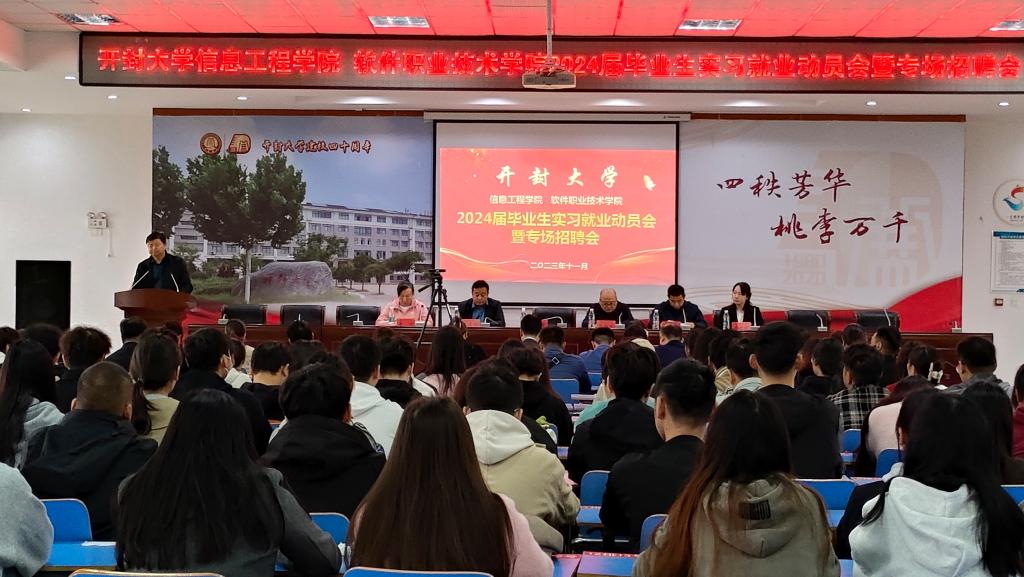为深入贯彻党的二十大精神,落实党中央、国务院“高质量充分就业,强化就业优先”的决策部署,11月4日,信息工程学院、软件职业技术学院在8号楼报告厅召开2024届毕业生实习就业动员大会暨专场招聘会。学校就业与校企合作处副处长王亚辉、信息工程学院党总支书记袁震、院长张新成、副院长李响、王晓婷及各教研室主任、辅导员老师和764名毕业生参加此次会议,党总支副书记李红礼主持会议。大会采用线上线下相结合的方式,设置了一个主会场,两个分会场。