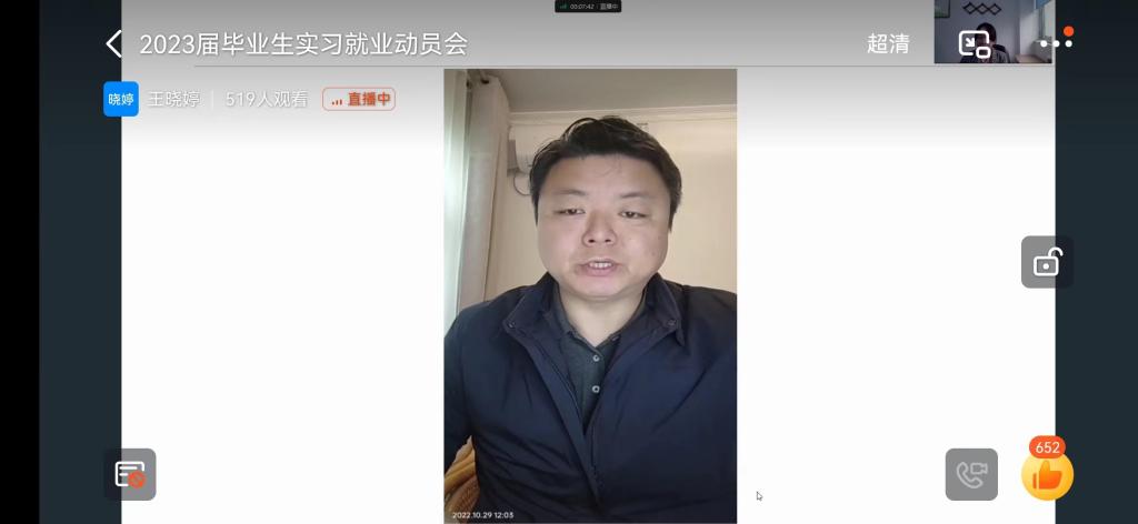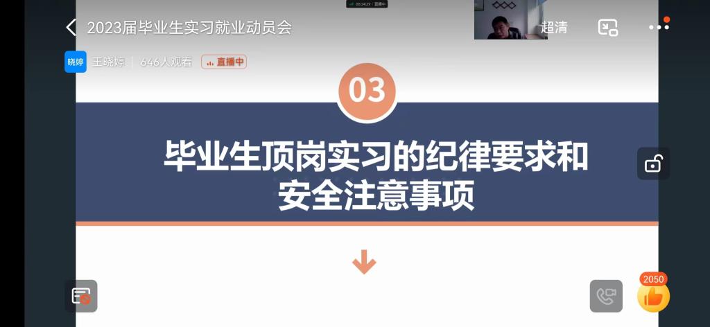 本站讯 10月30日上午10点,信息工程学院、软件职业技术学院利用钉钉直播召开了2023届毕业生实习就业动员大会暨实习安全教育大会,大会由副院长王晓婷主持,学院领导、实习指导教师、辅导员和全体2023届毕业生参加了会议,参会人员700余人。