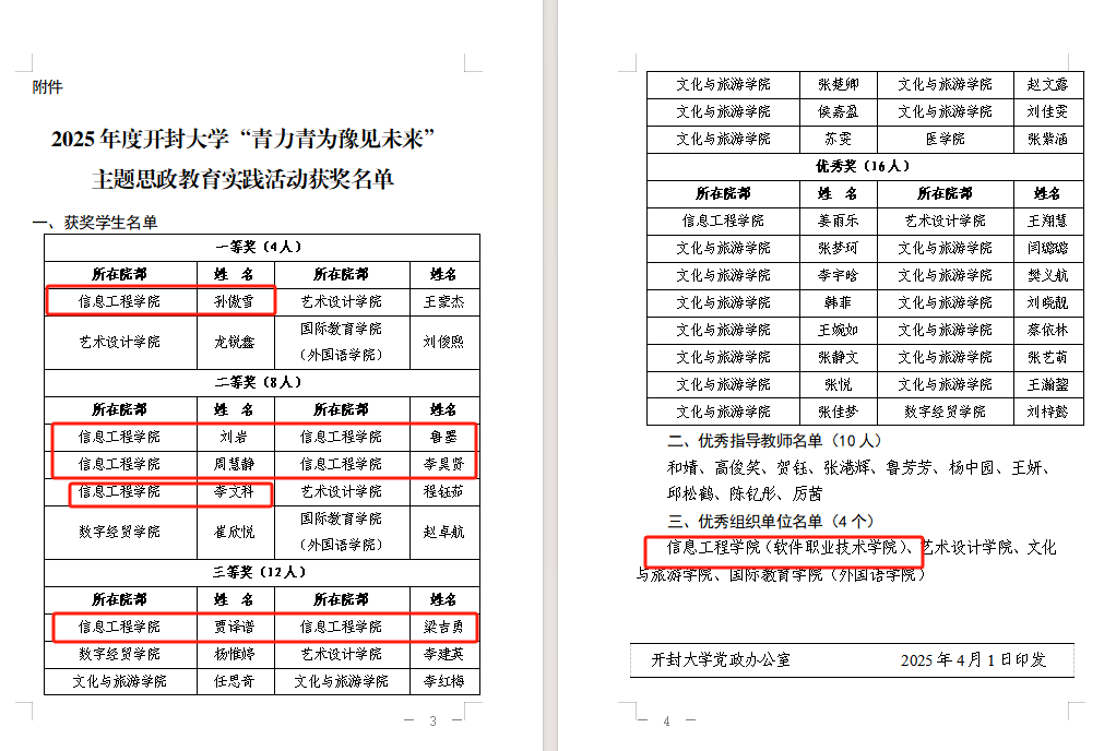 近日,开大校发〔2025〕21号文件表彰了学校2025年度bat365在线官方网站“青力青为豫见未来”主题思政教育实践活动先进个人和先进集体,我院喜获佳绩。