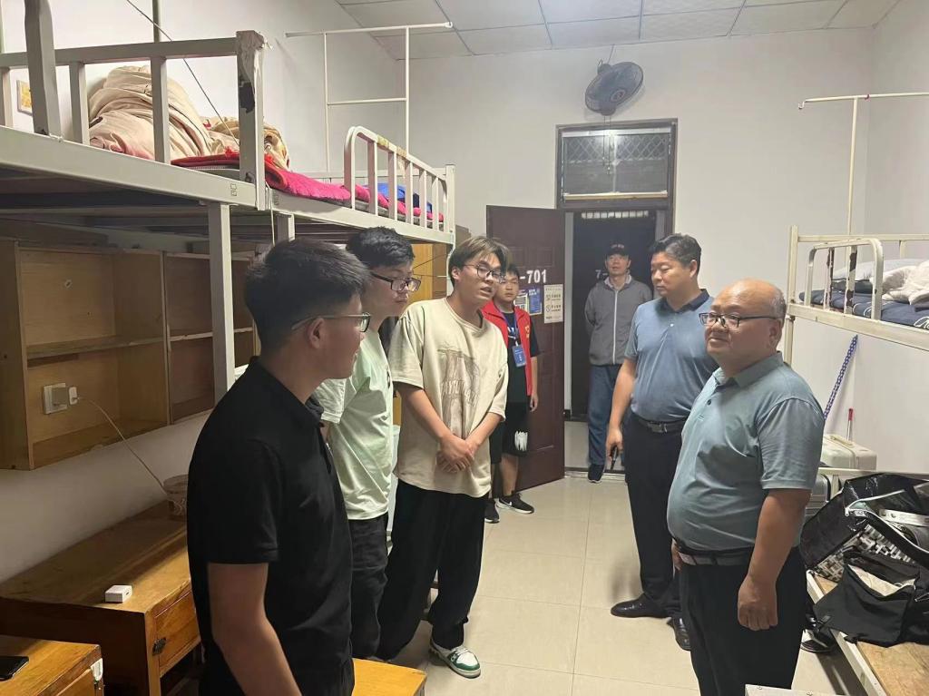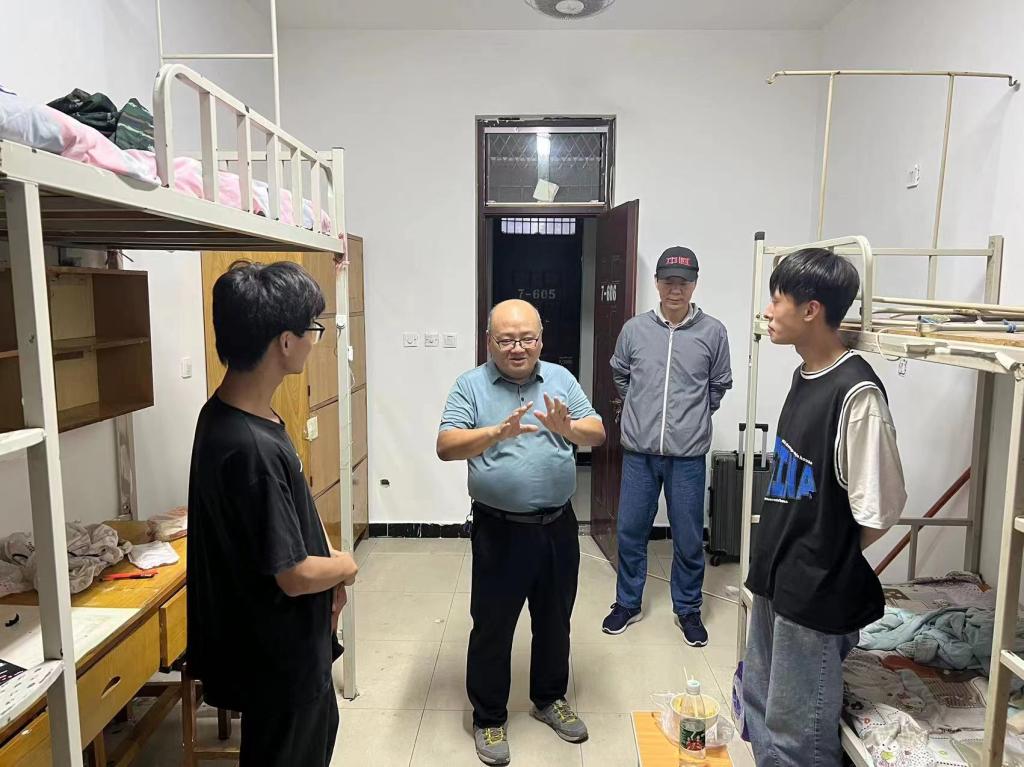 走访过程中,学院领导、老师们与新生亲切互动交流,对同学们的到来表示欢迎,详细询问了同学们的家庭情况和对学校环境的适应情况。袁书记叮嘱同学们注意用电安全,加强防诈防骗意识,遵守校园管理规定,并对新生们未来的成长给予了殷切期望;张院长嘱咐大家迅速适应大学生活,转变角色,合理规划学习时间,度过美好的青春时光,在宿舍里要相互关心、相互帮助,共同营造良好的学习、生活氛围,以崭新的精神面貌投入大学生活。学院领导老师还分享自己读书时期的故事,并就新生存在的疑惑和问题给予耐心解答。
