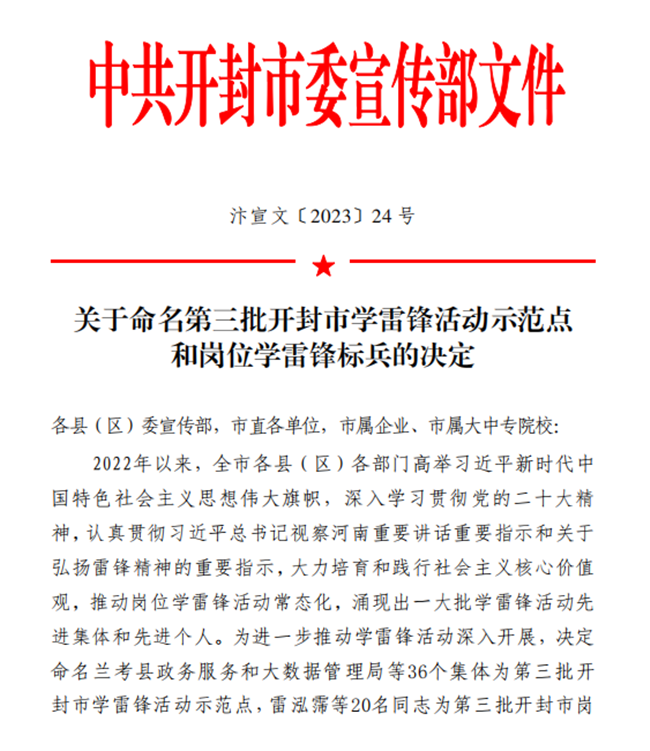 本站讯 近日,中共开封市委宣传部下发《关于命名第三批开封市学雷锋活动示范点和岗位学雷锋标兵的决定》(汴宣文〔2023〕24号)文件,bat365在线官方网站信息工程学院被命名为第三批开封市“学雷锋活动示范点”。