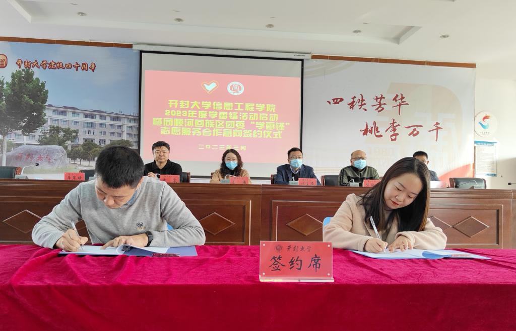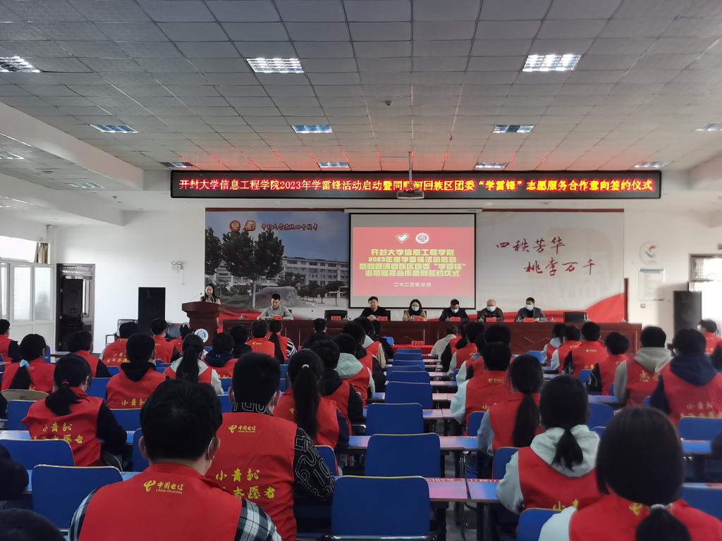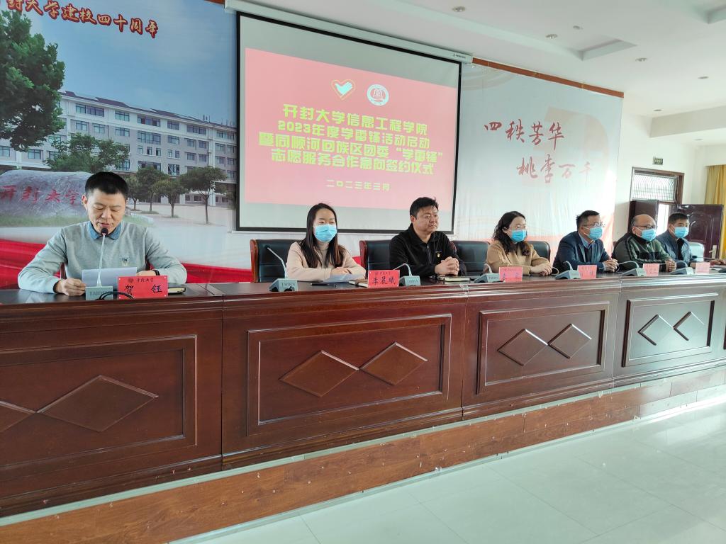 本站讯 3月2日下午,信息工程学院在土木六楼报告厅举行2023年度学雷锋活动启动暨同顺河回族区团委“学雷锋”志愿服务合作意向签约仪式。共青团开封市委副书记孙楠、共青团顺河回族区委副书记李晨曦、校团委书记刘圣亚、信息工程学院党总支书记袁震、院长张新成、校团委老师代表、机械与汽车工程学院和财政经济学院团总支书记、信息工程学院学生工作队伍及小青訫青年志愿者代表120人参加仪式。启动仪式由院团总支书记贺钰主持。
