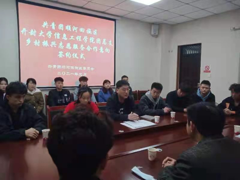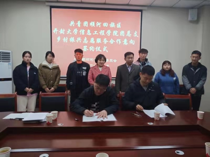 本站讯 为了更好的践行青年志愿者精神,引导青年学生利用专业优势在国家“乡村振兴”工作中发挥自身作用;响应团省委关于高校基层团组织团员到社区开展志愿服务、劳动教育和社会实践工作,助力城乡社区治理,引导大学生团员在服务社会中提升社会化能力;进一步提升信息工程学院实践育人和志愿服务工作的质量和成效;充实信息工程学院开学第一课的课程内容。3月19日下午,信息工程学院团总支与开封市顺河回族区团委在团区委举行了“助力乡村振兴志愿服务”项目合作意向签约仪式。顺河回族区团委书记武昕,校团委副书记李卓珊,信息工程学院党总支副书记高剑南出席了签约仪式。顺河回族区委部分工作人员,信息工程学院团总支负责人贺钰,信息工程学院学生党员、团员、小青訫青年志愿者代表参加了签约仪式。